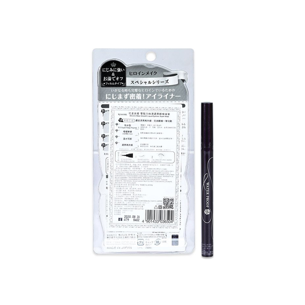 A smudge-proof liquid eyeliner in 01 Jet Black. It is waterproof with its new super waterproof formula, Super-Keep Polymer, that protects lines from tears, perspiration, oils and water, for beautiful, long-lasting definition. It has a 0.1mm extra fine brush that allows anyone to draw with ease. It contains 4 kinds of beauty liquid ingredients that moisturize the eyes. It washes off easily using warm water even though it is resistant to water. Harder to remove lines may be removed with facial cleanser.