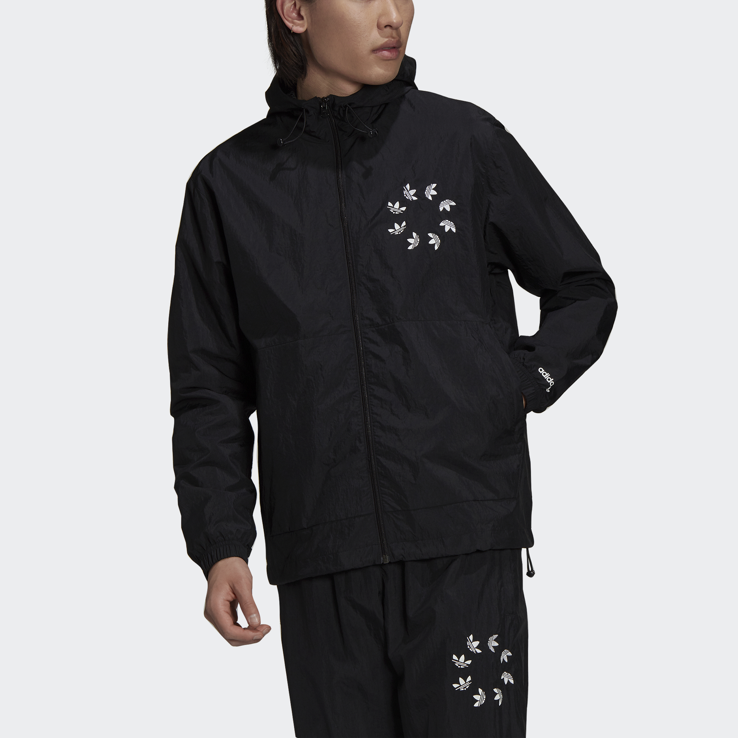 A little wind won't slow your roll. Not when you're layered up in the lightweight fabric and authentic style of this adidas windbreaker. Zip in and step out flashing a swirl of Trefoils. A nod to your creative spirit. Adjustable details help keep out blustery air. This product is made with Primegreen, a series of high-performance recycled materials.