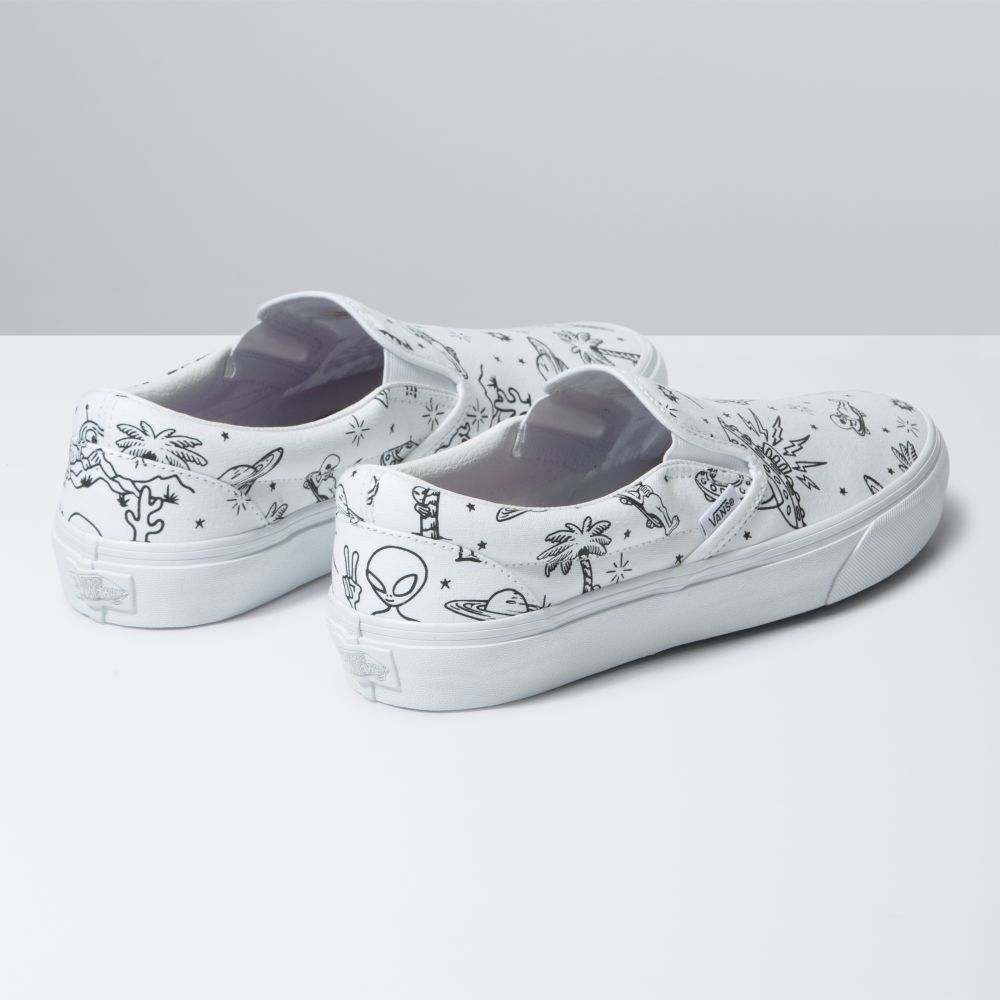 Featuring allover artwork that mixes aliens and UFOs with iconic palm tree and desert images ready for your unique creative twist, the Unidentified U-Paint Classic Slip-On is an everyday essential with true “Off The Wall” style. This timeless slip-on shoe also includes low profile canvas uppers, supportive padded collars, elastic side accents, and signature rubber waffle outsoles.