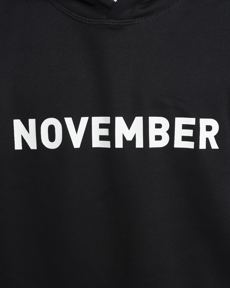 Regular Solid Coloured Long Sleeve Pullover Hoodie with Kangaroo Pockets at the front. Comes with NOVEMBER Slogan Patch at the front. Made of cotton.
