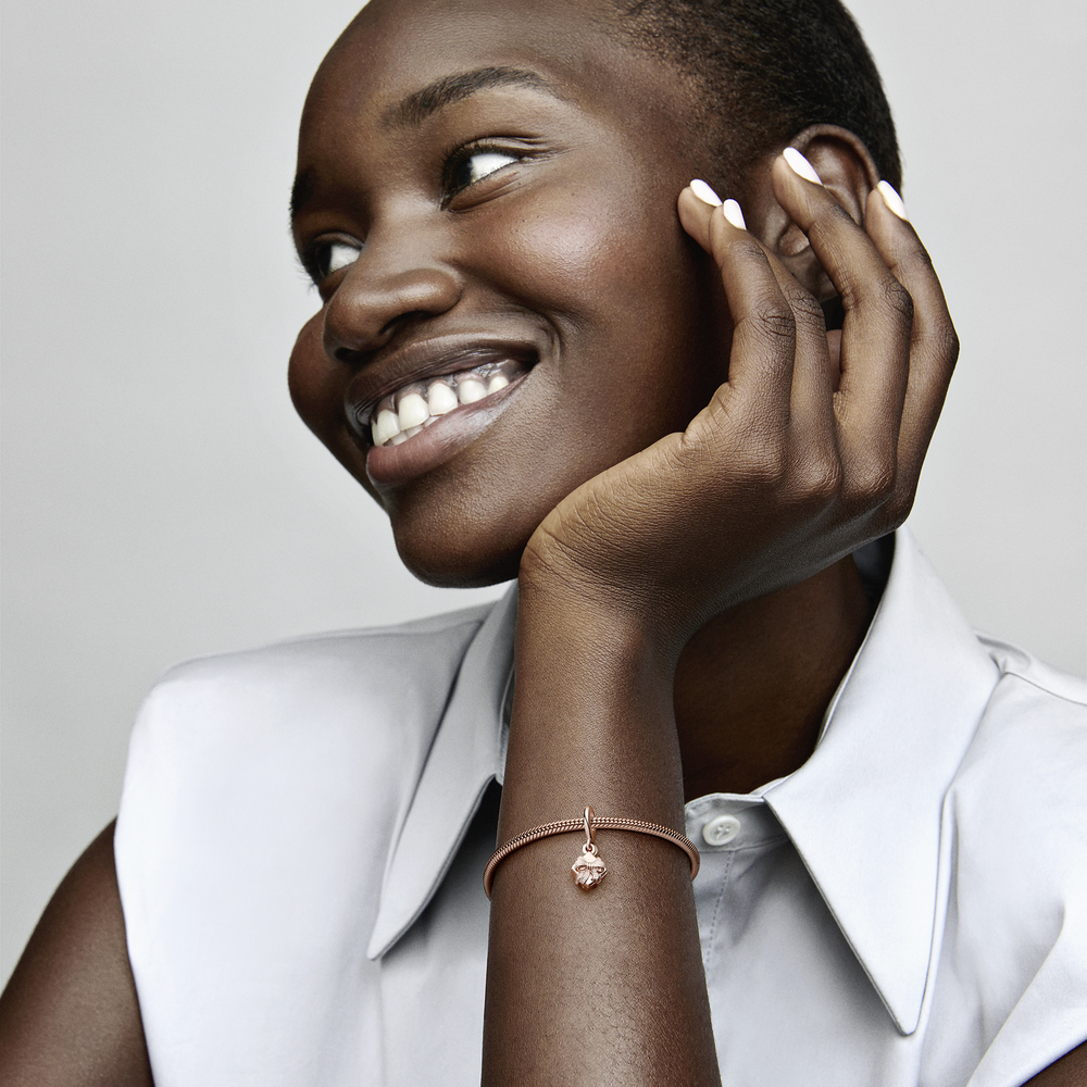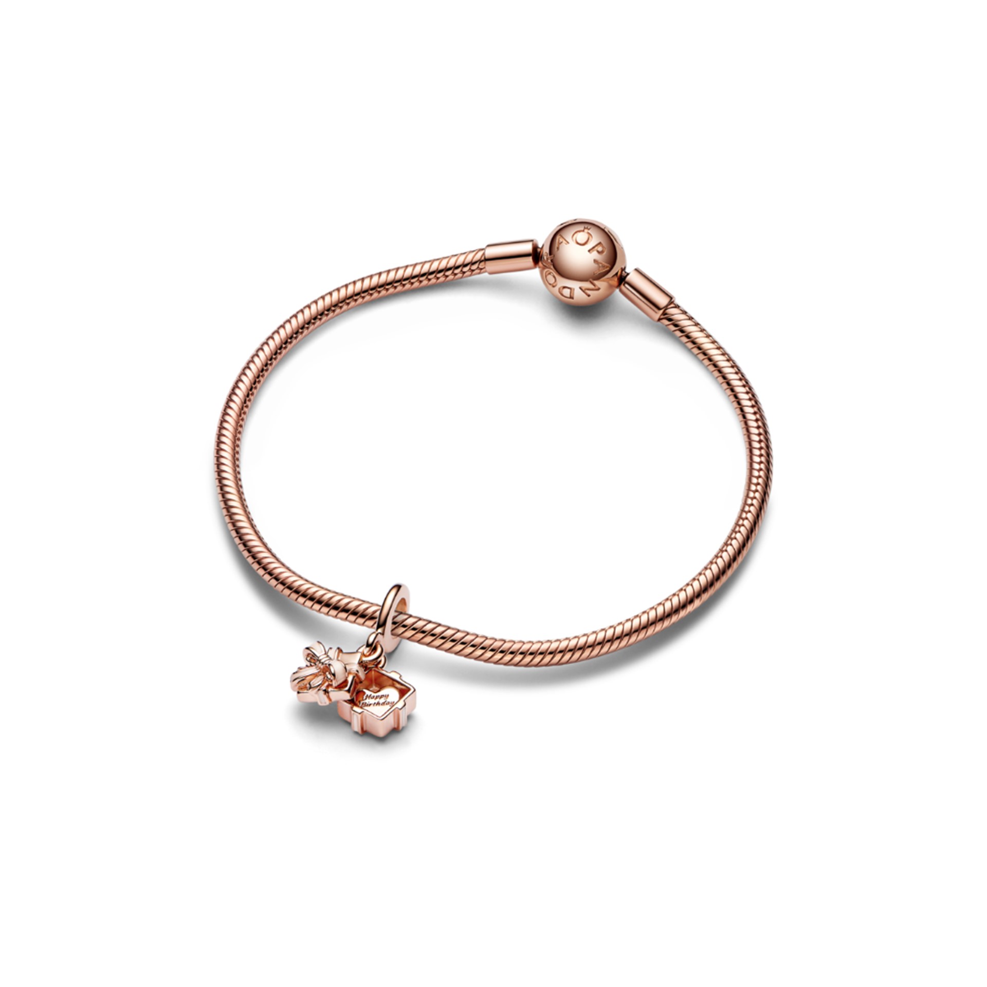 A sweet gift to make your loved one's birthday even more special. The Openable Birthday Gift Dangle Charm is finished in warm 14k rose gold plating and is shaped like a gift box with a soft pink enamel ribbon and bow. Open the box and you'll discover a raised heart with the engraved message "Happy Birthday." A special jewellery gift they can wear all year to remember that birthday glow.
